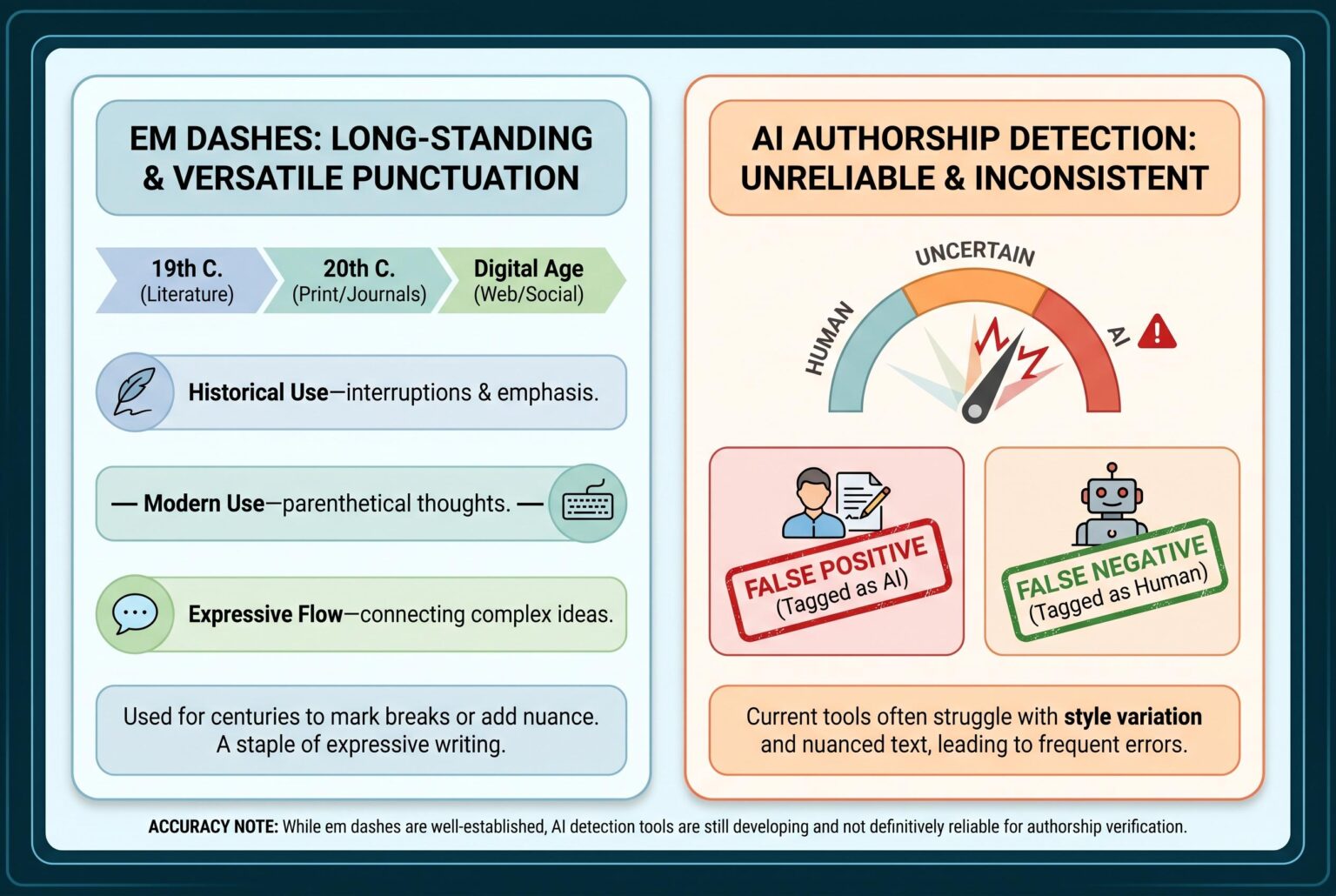 The myth that em dashes signal artificial writing endures, but experts argue that their long-standing use in language shows the question of authorship lies elsewhere, as AI detection remains unreliable.